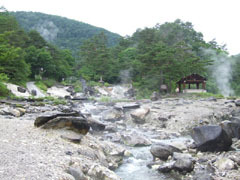 쿠사츠에서 처음 들린 곳은 저번에는 가지 않은 사이노 카와라 공원입니다. 이곳은 노천온천장이 있다기에 구경차 들렸습니다. 그러니까 온천이 강처럼 흐르면서 목욕을 노천에서 한다는 겁니다! 가보니 사방에서 뜨거운 물이 올라오면서 그냥 흘러가고 있었습니다. 어떤 곳은 미지근하고 어떤 곳은 너무 뜨거워서 발을 집어넣을수가 없는 곳도 있었습니다. 온천이라하면 대개는 건물밑에 있는 것으로 생각하는데 쿠사츠에서는 온천이 너무 흔해서 온천수가 사방에 냇물처럼 흘러다니는 것을 볼 수 있습니다. 그게 참 볼만하고 신기했습니다.