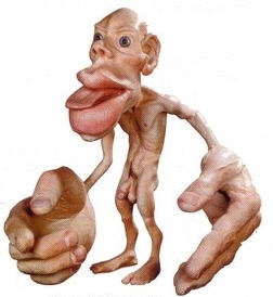 이 그림은 보통 호문클루스라고 말해지는 것인데 뇌에서 감각부분이나 운동조절기능을 담당하는 부분에 맞춰서 인간의 몸을 그려넣은 것이다. 위의 그림은 운동조절을 하는 영역이 각각 얼마나 넓은가를 보여준다. 예를 들어 우리는 이 그림에서 눈동자를 움직이는 부분은 작다는 것을 알수가 있다. 반면에 손과 입이 상당히 크다. 이것은 우리가 가장 섬세하게 움직일수 있는 몸의 부분이 입과 손이라는 것을 말해주는 것이다. 즉 정보출력장치로서 유력한 후보자는 컴퓨터가 아무리 발전해도 여전히 손과 입이라는 것이다. 입은 당연히 말을 하는데 쓰이는 곳이다. 눈동자 움직임이나 발가락 움직임, 고개를 까닥거리기 같은 것으로 컴퓨터에게 신호를 보내는 일은 비효율적이다.