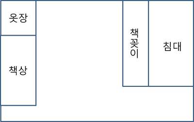 언제나 그렇지만 이게 정답인지는 모르겠다. 그렇지만 왜 이런 구조인지 설명해 보자. 여기서 말하는 책꽂이는 높이가 3단정도밖에 안되고 옆으로 긴 책꽂이다. 그래서 그 위로는 그 너머가 보인다. 따라서 작은 방을 너무 답답하게 만들지 않을 것이다. 그 긴 책꽂이는 학생이 필요한 최소한의 수납공간을 제공하고 교과서라던가 언제나 보는 책이라던가 하는 것을 가지고 있을 공간이다.