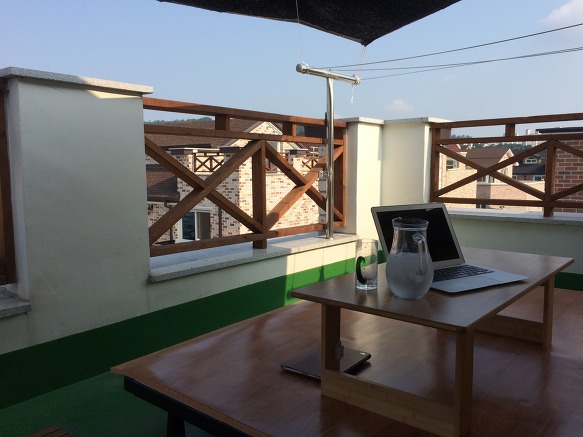 차양막을 사다가 지붕에 이어붙이는 식으로 해서 그늘을 늘렸다. 그러니까 옥탑 베란다의 모습은 지붕처마밑에 놓은 평상이 되었다. 그 평상에 앉아보니 이런 좋은 공간이 따로 없다.