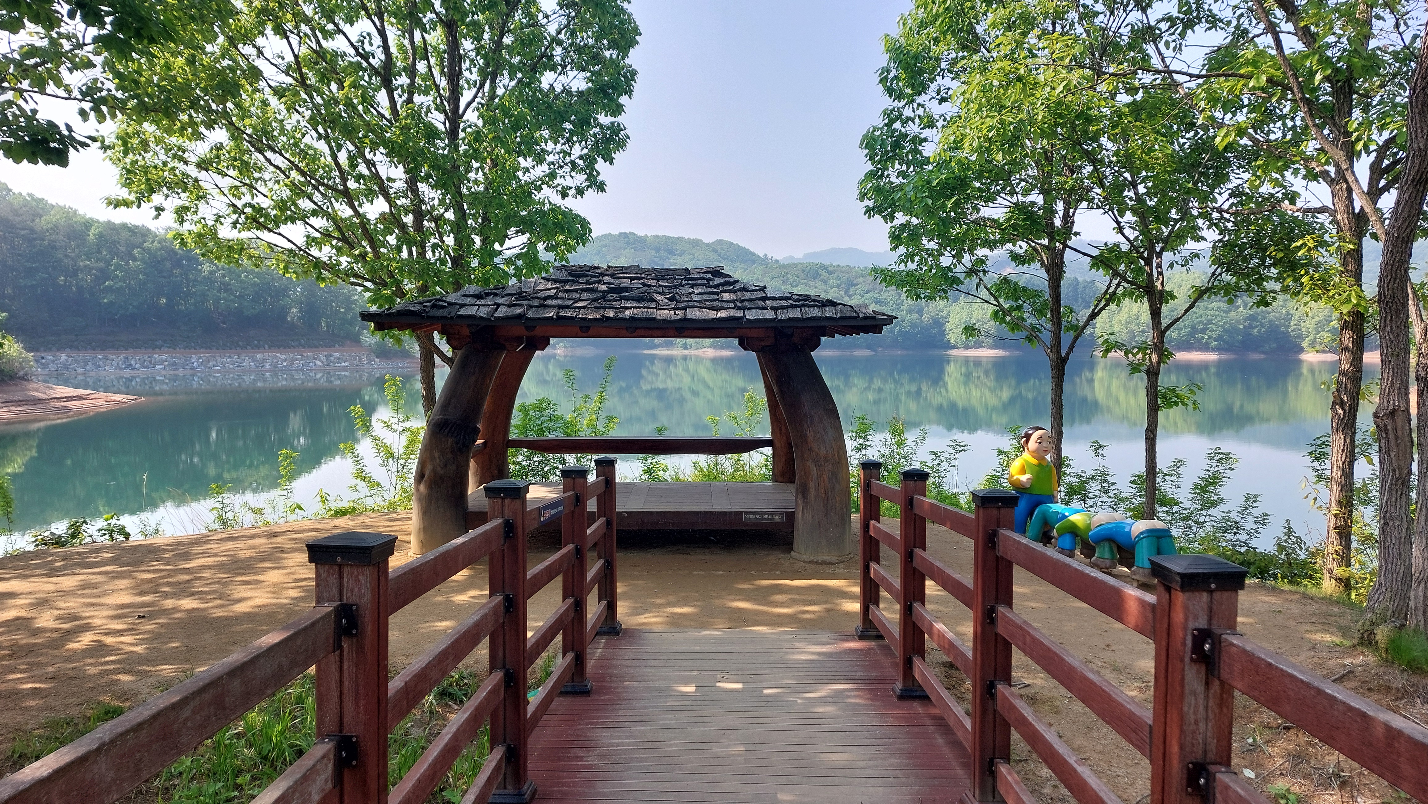 그리고 다음날 새벽 6시에 눈을 뜨고 보니 눈앞에 펼쳐진 호수위로 떠오르는 해가 보인다. 장관이다. 마음같아서는 최근에 그렇게 했듯이 당장 산책을 하고 싶지만 이 호수길은 아침 9시가 되어야 열린다. 입장료도 있다. 본래는 2천원이었는데 5월은 천원이다. 어느 쪽이건 그 돈값은 하고 나는 쓰지 않았지만 지역상품권으로 돌려주기도 한다.