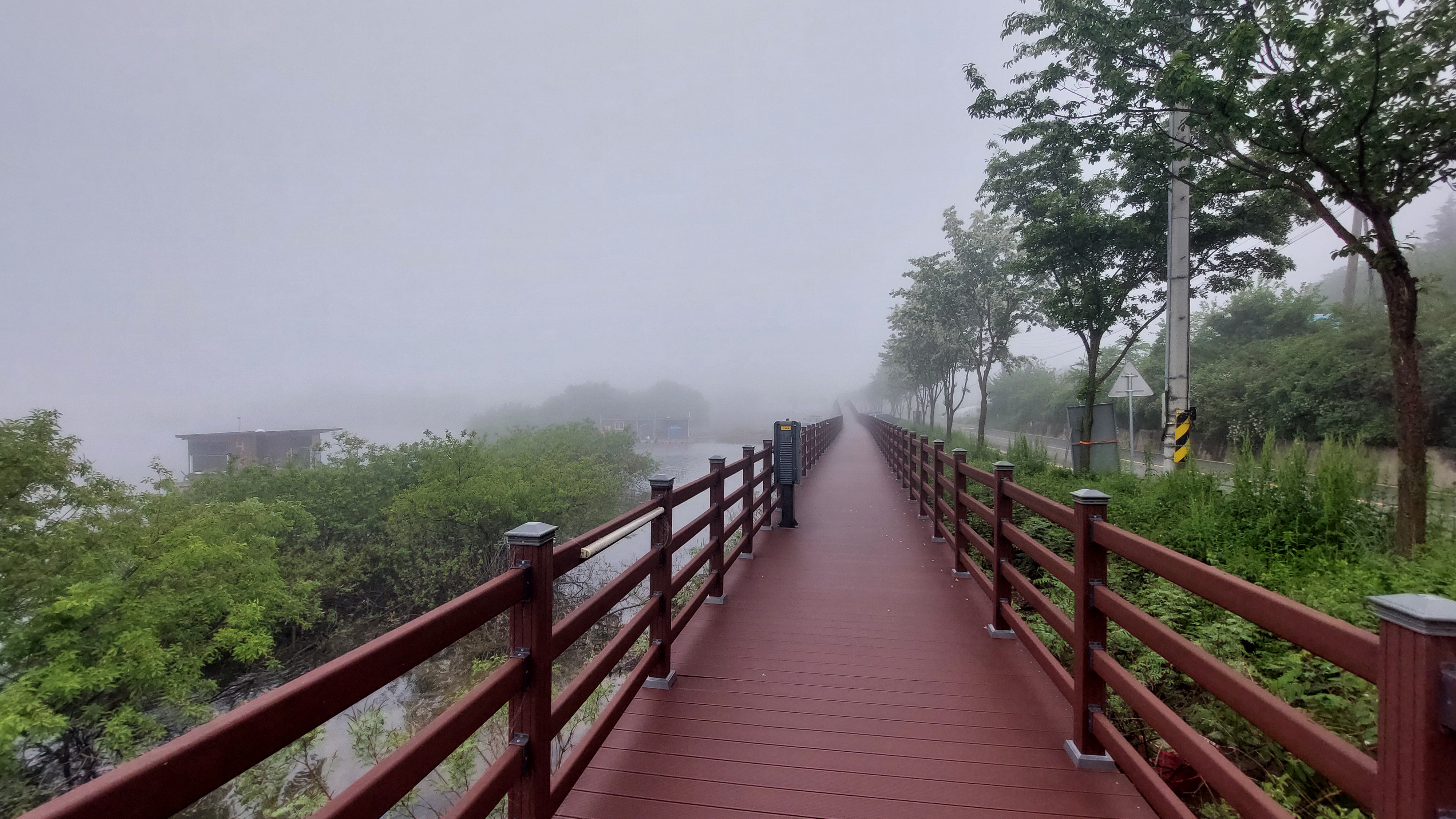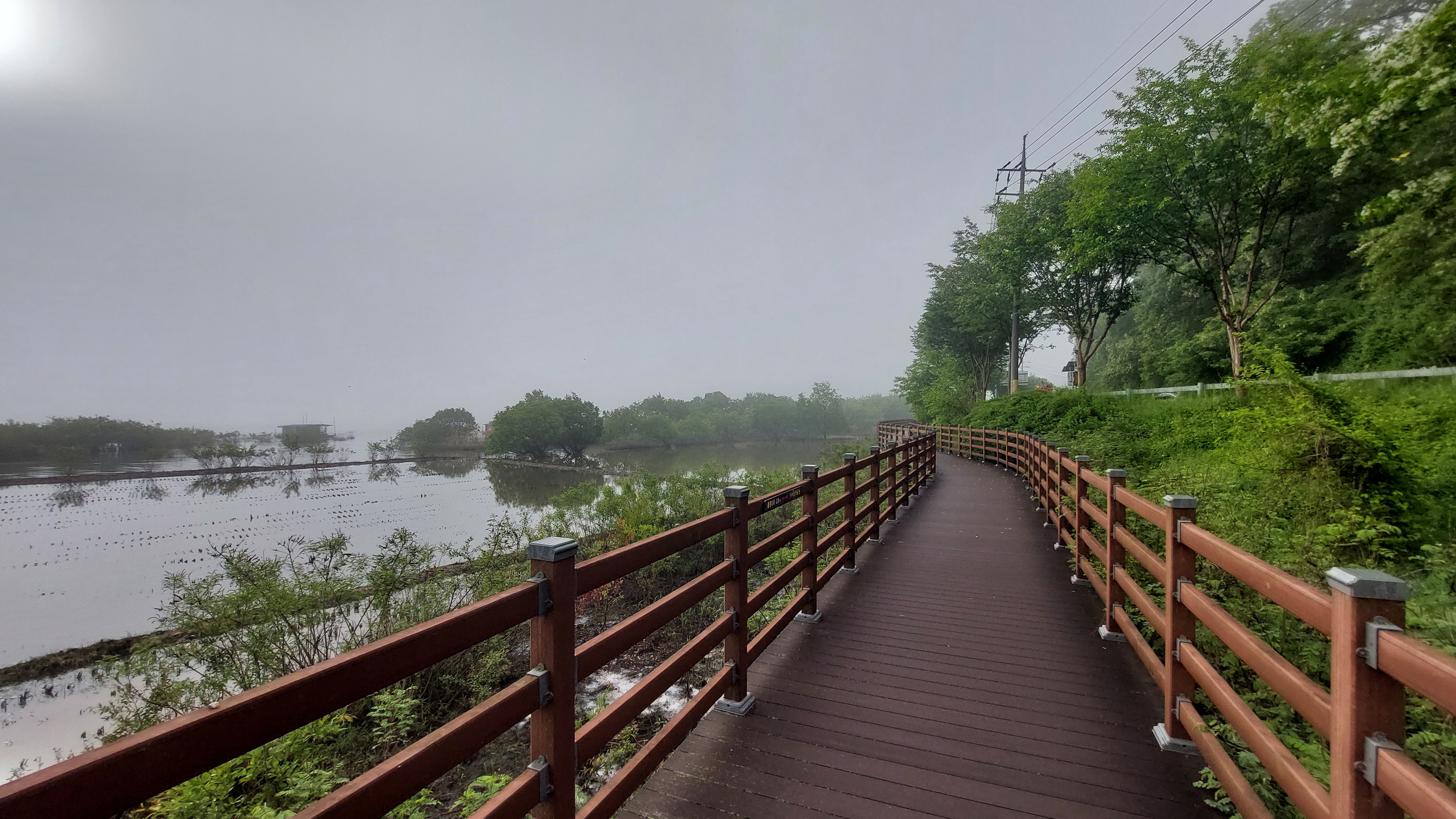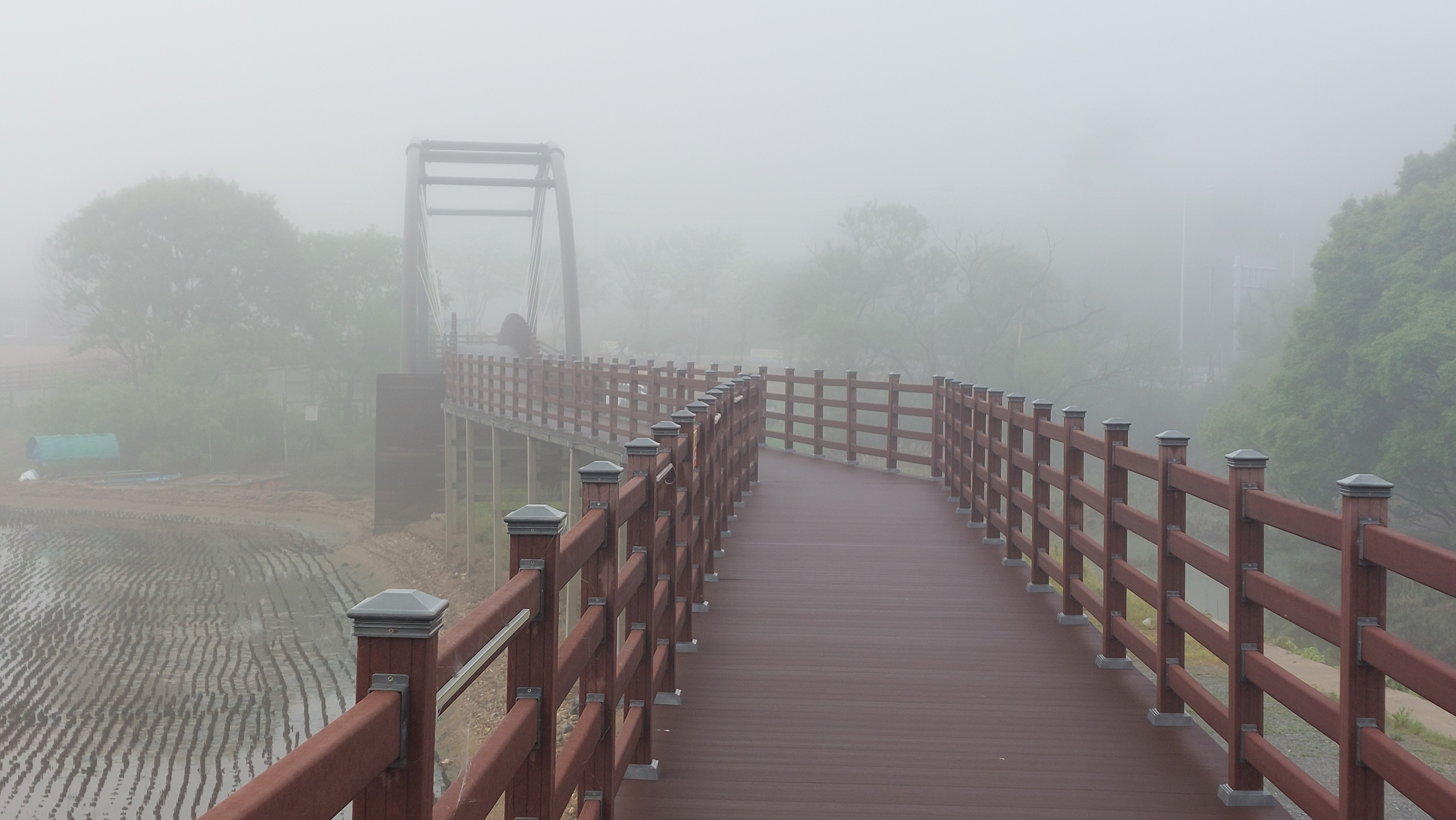 비는 오늘밤에도 많이 내렸다. 하지만 아침이 되니 짙은 안개만 있을 뿐 비는 그쳤다. 세수를 하고 출발시간을 보니 6시 45분 아직도 호수는 짙은 안개로 덮여 있다. 예당관광지를 중심으로 호수를 바라보았을 때 왼편으로는 출렁다리가 있다. 본래는 출렁다리를 건너서 한동안 더 걸을 수 있게 되어 있는데 이날은 수리중이라면서 출렁다리를 건너는 정도만 출입이 가능했다. 오른편으로는 슬로우 호수길이라는 데크길이 5km쯤에 걸쳐서 펼쳐져 있다. 왕복으로는 10km다. 순환해서 원래 자리로는 돌아올 수 없어서 간만큼 거꾸로 돌아나와야 한다. 경사로는 거의 없어서 오늘은 오랜만에 명상을 하면서 걷는 산책이 될 예정이다.