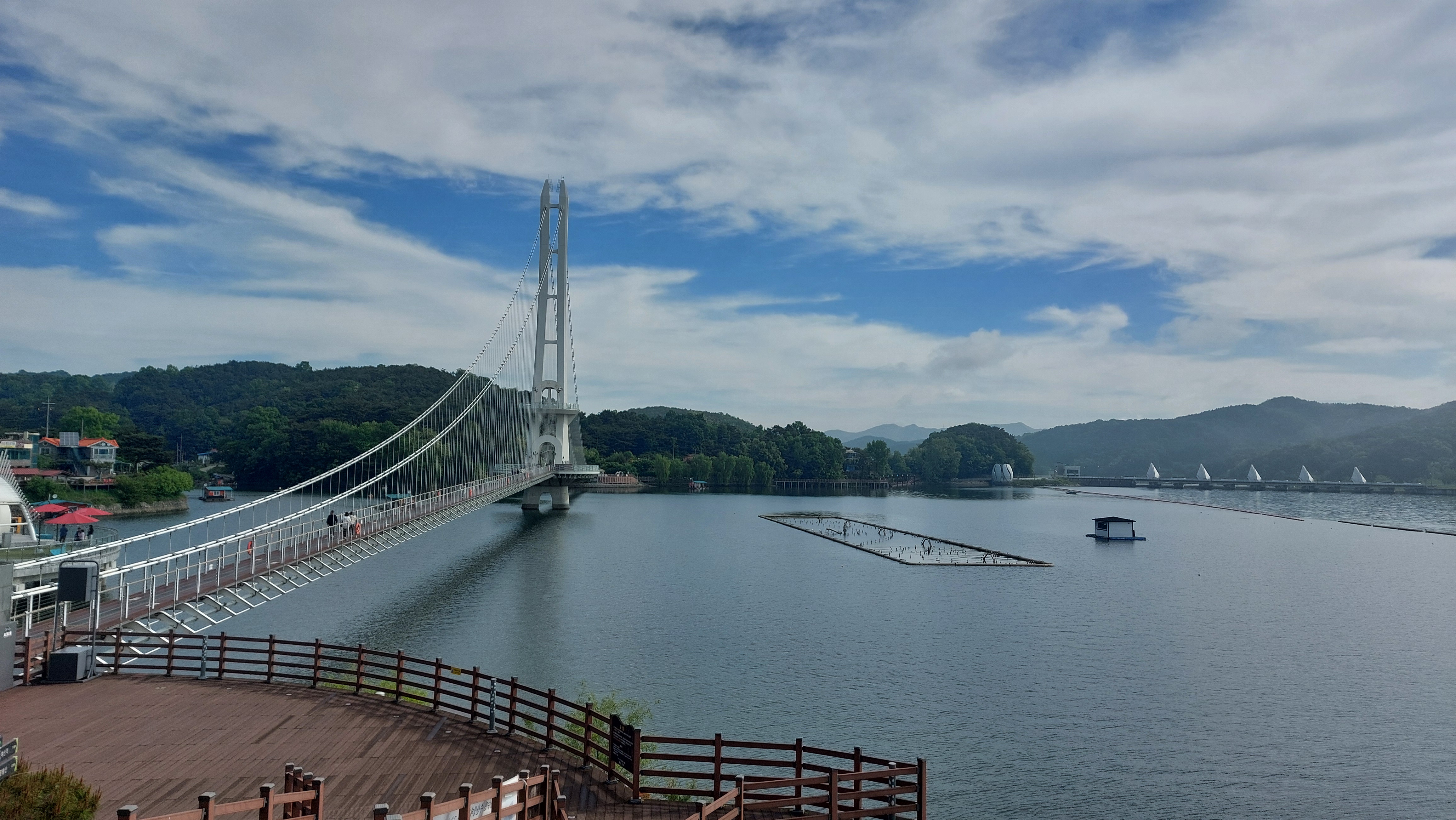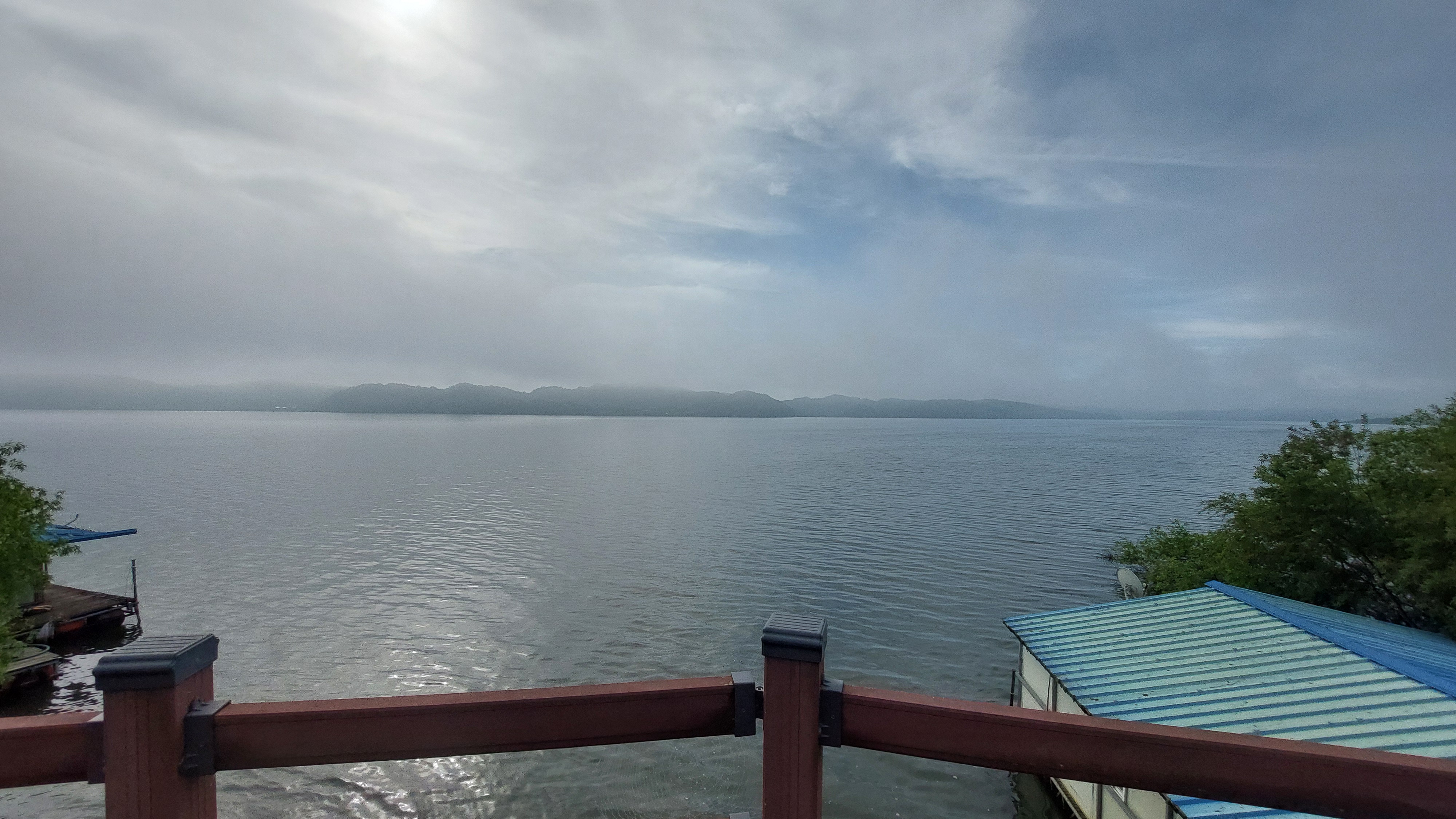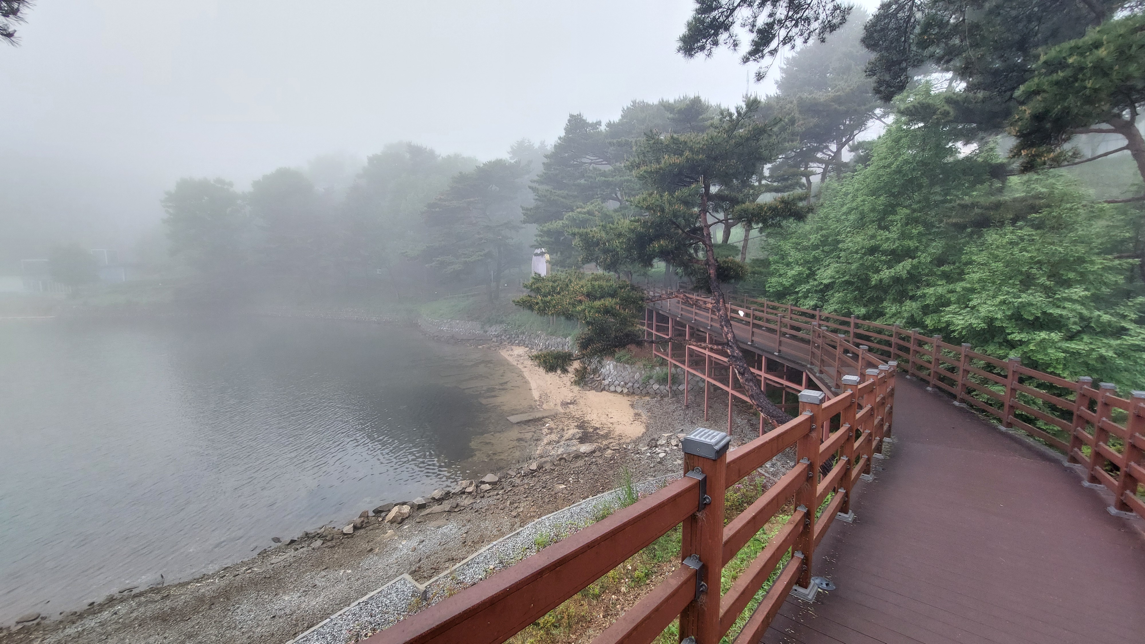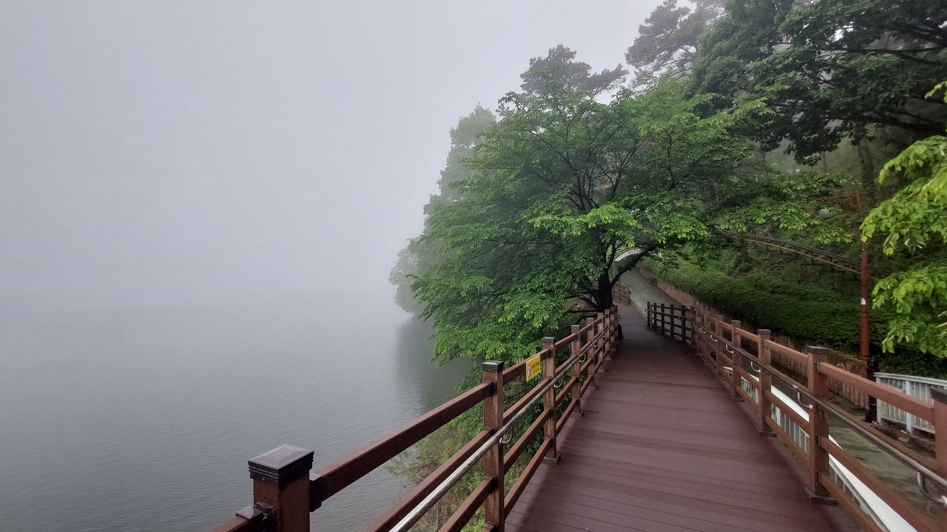 데크길의 끝에 도달해서 돌아오는 쯤에는 시간을 보니 8시가 넘었다. 데크길만 해서 왕복 10km쯤 되는데 중간에는 전망대 역할을 하는 정자가 하나 있어서 원한다면 계단으로 올라갈 수 있다. 데크길의 끝에서 바로 되돌아와서 다시 출렁다리의 시작점이 있는 곳으로 돌아올 무렵에는 8시 50분이 되어있었고 햇살이 뜨거워 지자 안개들이 산쪽으로 물러나서 호수의 전망이 잘 보이게 되었다.