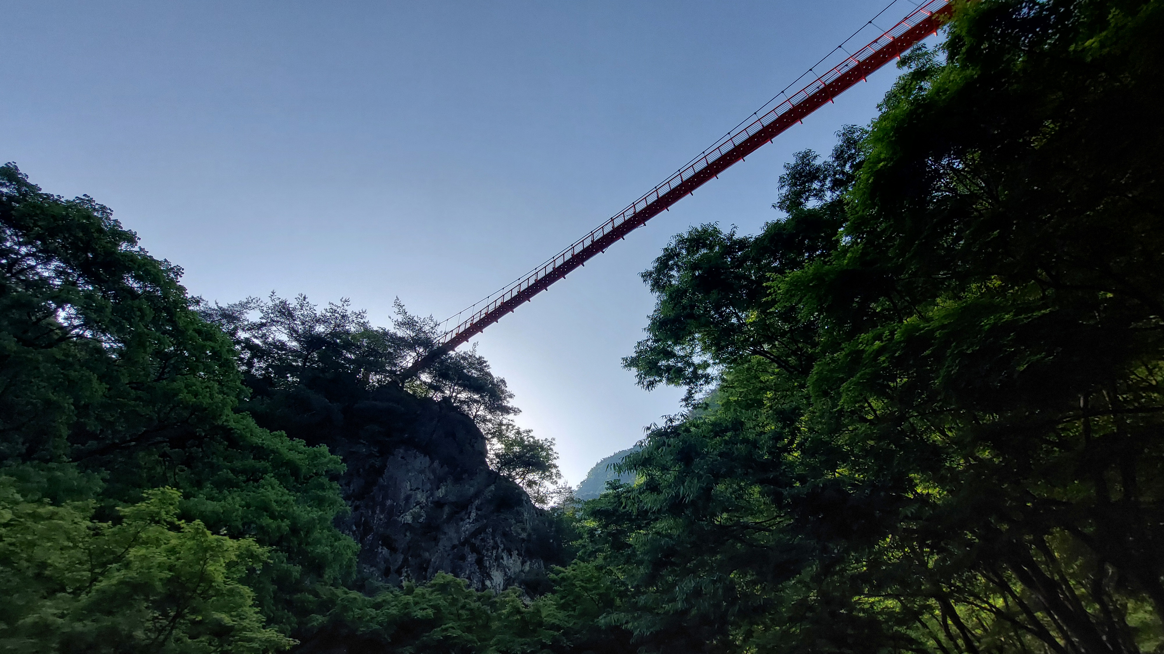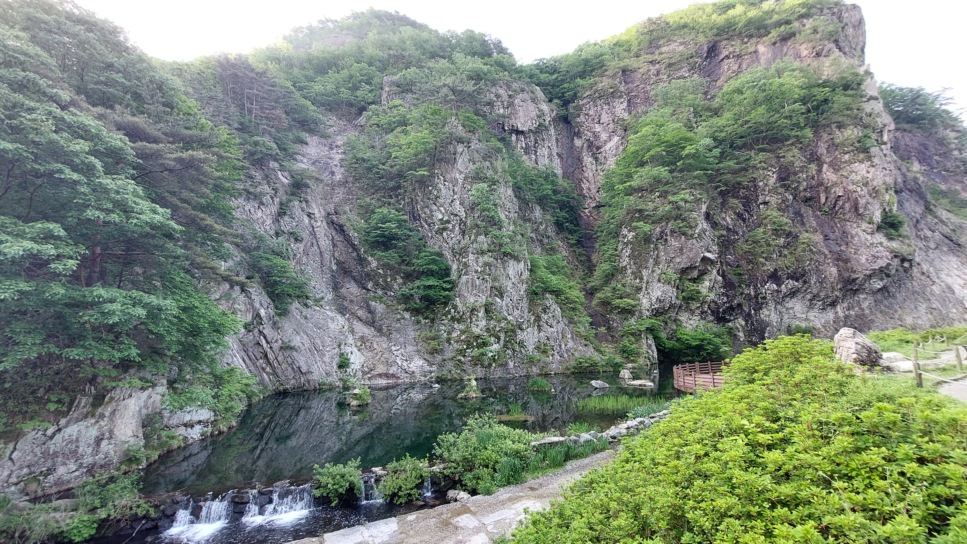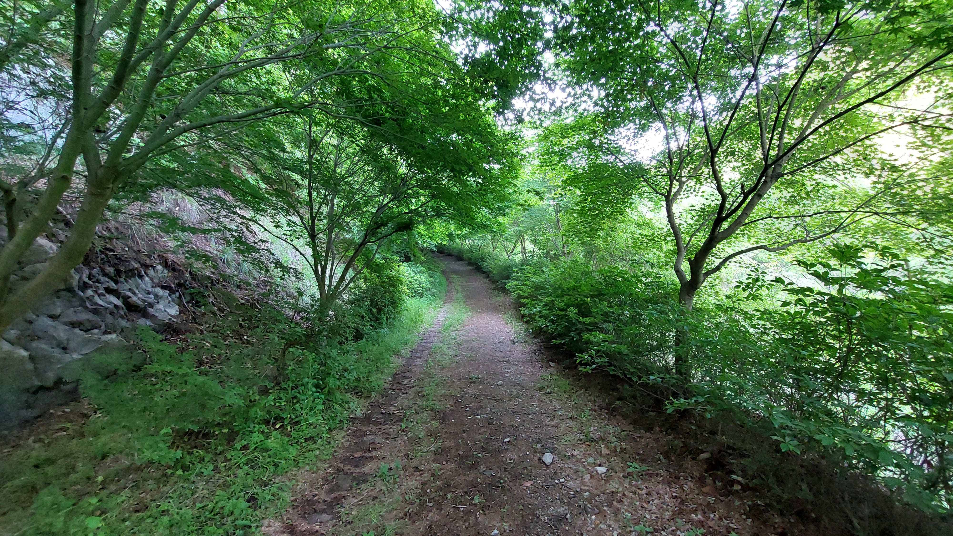 이 날은 최근 출렁다리를 워낙 많이 봐서 출렁다리는 올라가지 않기로 했다. 그대신 구장군폭포에서 헬기장까지 산길을 걸었다. 거리로는 2km정도지만 경사가 있어서 앞의 평탄한 길보다 오히려 더 어렵고 사실 대단한 구경거리는 없다. 선녀계곡길이라는데 단풍나무가 너무 무성해서 계곡이 안보인다. 다만 이 단풍나무 터널이 단풍 계절에는 예쁘지 않을까 하는 생각을 했다. 사람들이 잘 걷지 않는 길이라는 것이 길위에 자라난 풀로 느껴졌다. 잠깐만 걸어가려고 간 길인데 뭐가 나올때까지 걷는다는게 헬기장까지 가버렸다. 이 길은 총 11km였고 나는 이걸 2시간 반동안 걸었다. 구장군폭포까지만 갔다가 오는 길은 왕복 6km 정도의 평탄한 길이다.